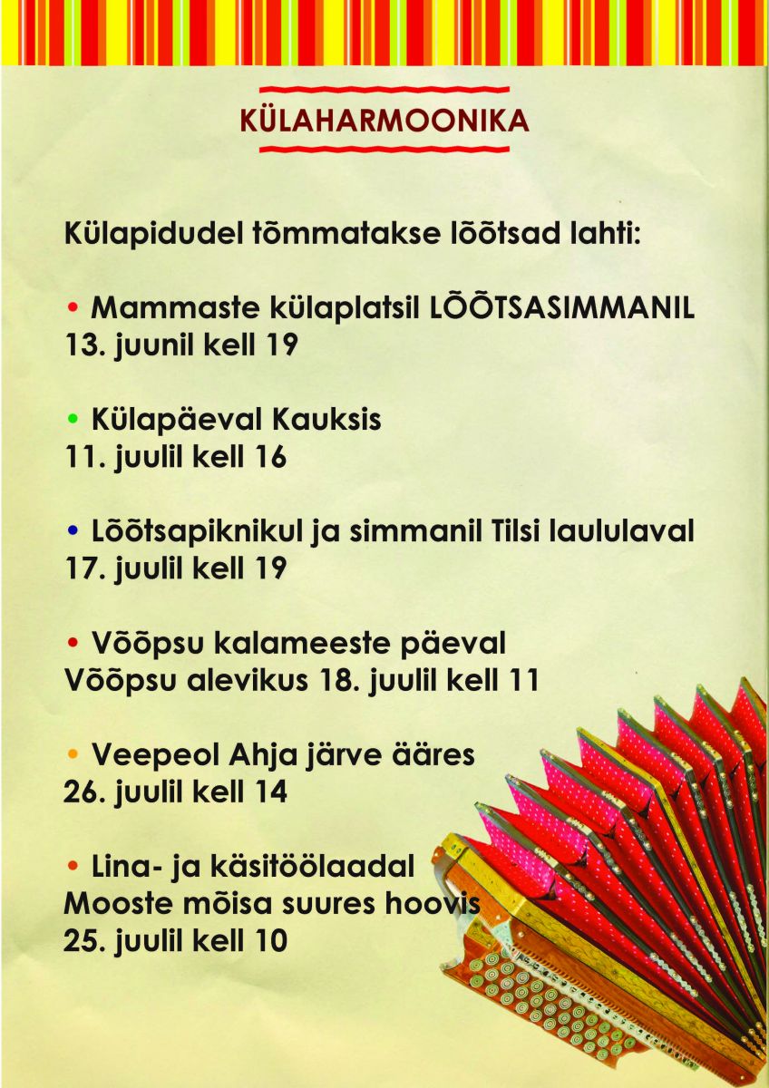 Harmoonika peoga on paaril viimasel aastal kaasnenud ka väiksemad külapeod - külaharmoonikad. Selgi aastal astusid lõõtspillimehed peo eelõhtul, 17. juulil üles Tilsi külasimmanil ja Võõpsu suvesimmanil. Suurem lõõtspillimängijate osalusega külaharmoonika toimub 22. augustil Valgjärvel, Karl Kikka kodupaigas. 23. augustil astuvad lõõtspillimängijad üles ökofestivali kontsertprogrammis Karilatsis. Kõlab hästi!
