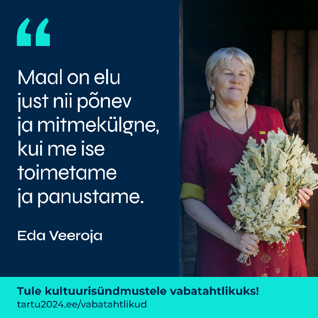 Tule vabatahtlikuks! Sel aastal kubiseb Lõuna-Eesti meeleolukatest Euroopa kultuuripealinn Tartu 2024 sündmustest, mis vajavad õnnestumiseks just sinu abi. Tule kodukandi kultuurisündmustele...