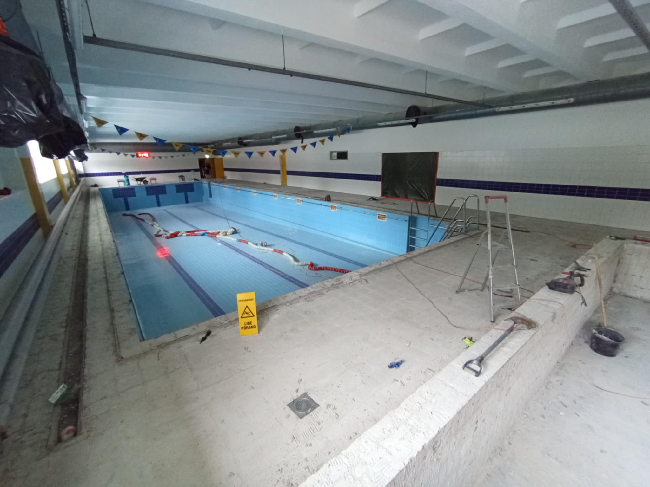 Remont hõlmab lastebasseini, 25 m basseini ümbrust ning suure basseini serva. Vanad plaadid ja hüdroisolatsioon on eemaldatud ning betoonkiht peab enne uue hüdroisolatsiooni, tasanduskiihi ja plaatide paigaldamist kuivama umbes kolm nädalat.