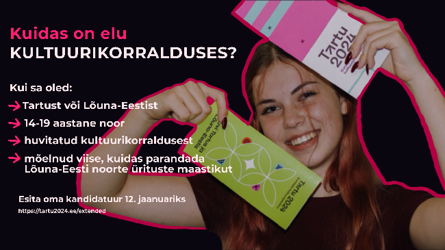 Tartu 2024 Extended kutsub kõiki 14–19-aastaseid Lõuna-Eesti noori avastama kultuurikorralduse maailma ning panema oma ideed proovile! Ära maga maha võimalusest teha koostööd koos...