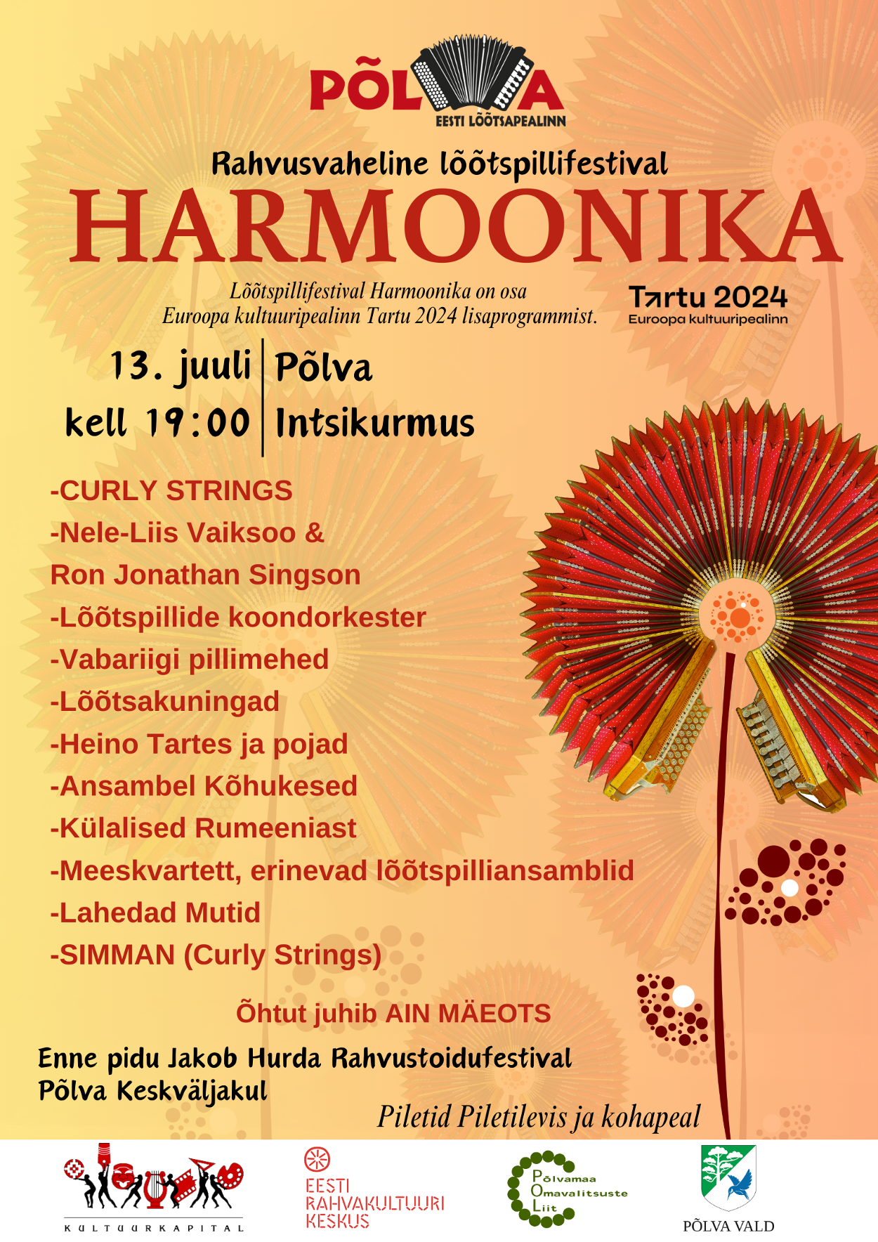 13. juuli õhtul toimub Intsikurmus järjekorras 13. rahvusvaheline lõõtspillifestival Harmoonika ja päeva esimeses pooles Põlva keskväljakul Jakob Hurda Rahvustoidufestival.
