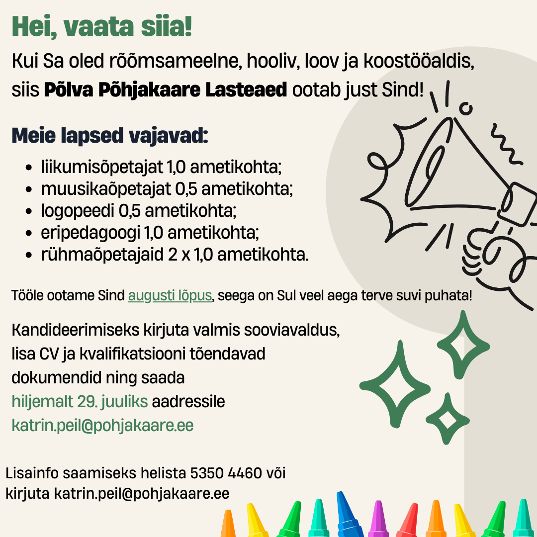 Tööpakkumised Põlva Põhjakaare Lasteaias